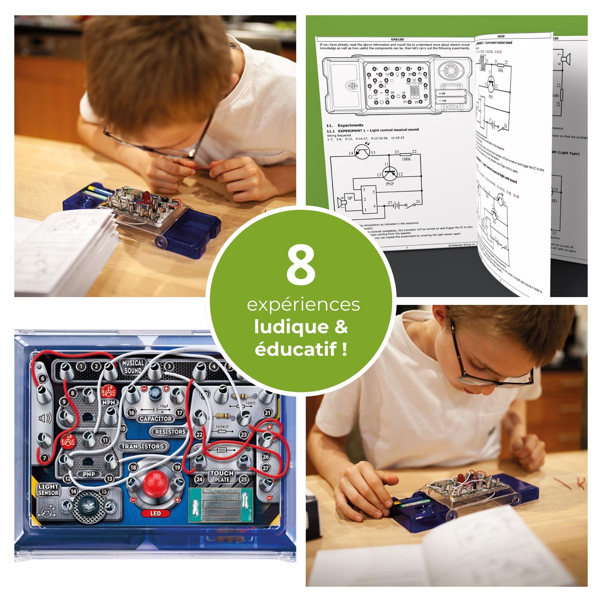 Nous sommes ravis de vous inviter à découvrir ce kit de circuits électroniques prêt à l'emploi, conçu pour les enfants de 8 ans et plus. Vous serez surpris par tout ce que vous pouvez apprendre, car ce kit offre une approche réaliste de l'électronique et de l'électricité. Il vous permettra d'acquérir des connaissances sur les composants, les circuits, et les théories électroniques, tout en vous familiarisant avec des concepts clés comme l'électricité, la tension, le courant, la résistance, le magnétisme, et d'autres principes fondamentaux.