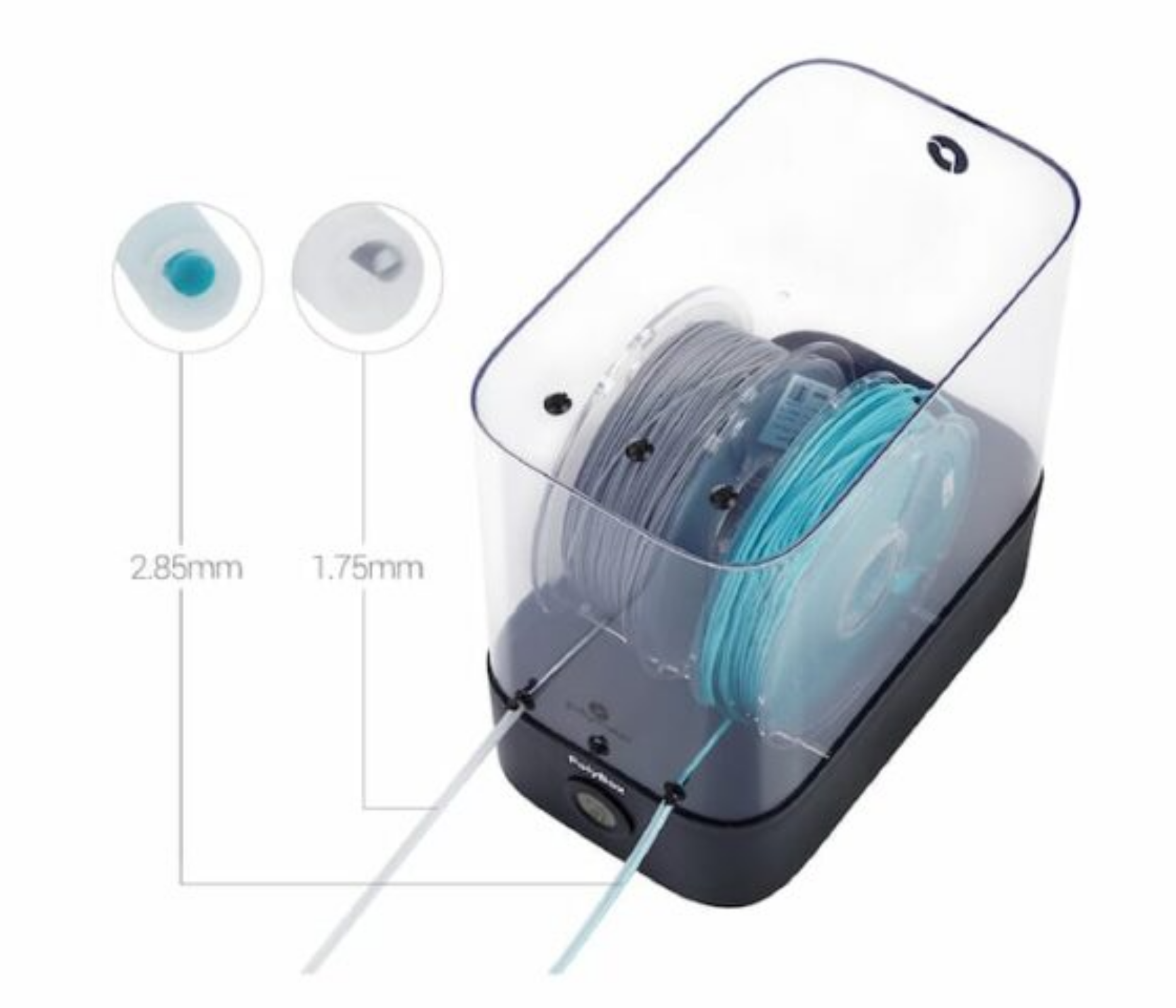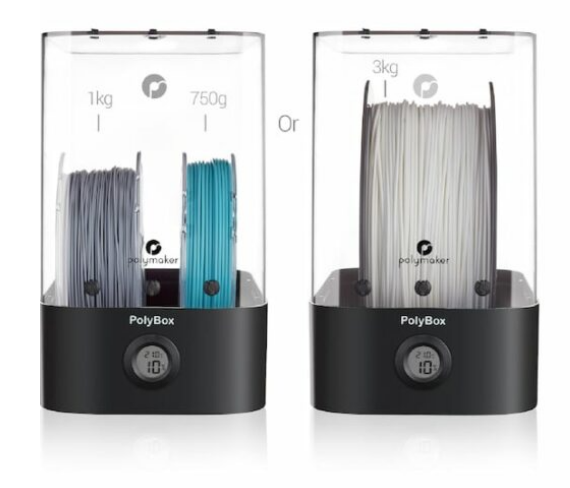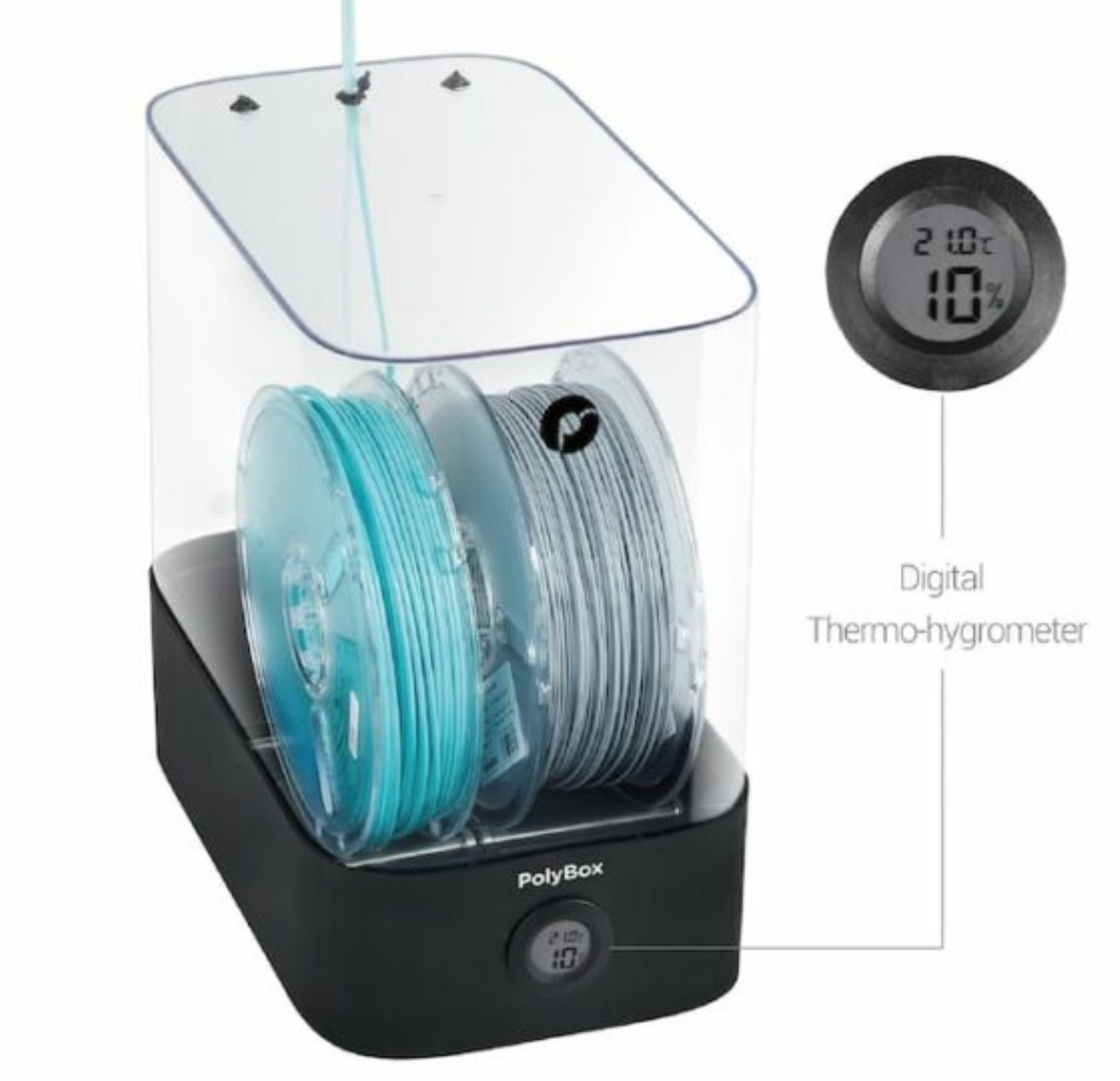 La PolyBox est une boîte de stockage à sec conçue pour fournir un environnement optimal pour les filaments d'impression 3D. La PolyBox est compatible avec toutes les imprimantes 3D et peut accueillir deux bobines de 1 kg ou une bobine de 3 kg.