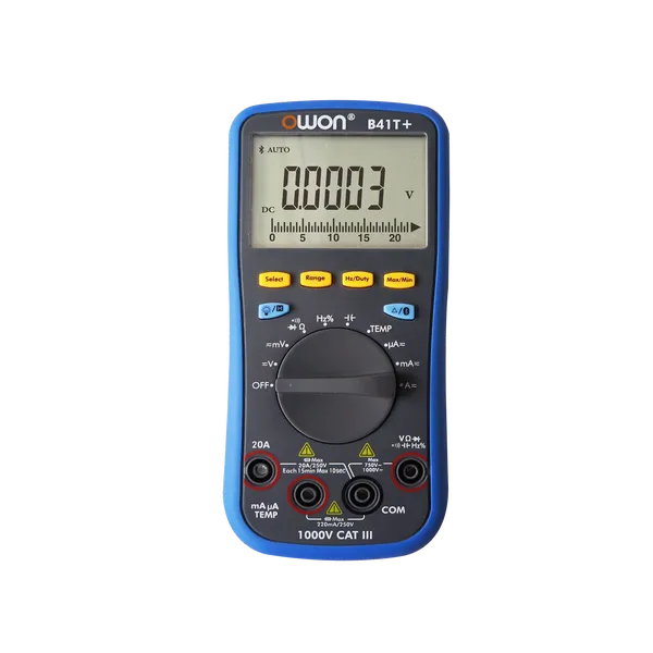 Le multimètre numérique OWON B41T+ 4 1/2 avec Bluetooth True RMS est un multimètre avec sa fonction 3 en 1, enregistreur de données, multimètre et thermomètre. Le B41T+ dispose d'une prise en charge multi-connexion (plus d'un appareil) via une application mobile avec analyse des tendances de changement accessible via un mode graphique spécial. L'appareil prend également en charge l'avertissement vocal, ce qui garantit la sécurité des mesures. L' option de mise hors tension intelligente prolongera la durée de vie de la batterie. La version Bluetooth 4.0 - prend en charge les appareils mobiles avec Android 4.3 ou supérieur / iOS 7.0 ou supérieur OS, et équipé d' une fonction d'enregistrement hors ligne du module Bluetooth 4.0 (uniquement sur le modèle avec « + »)